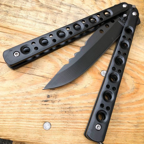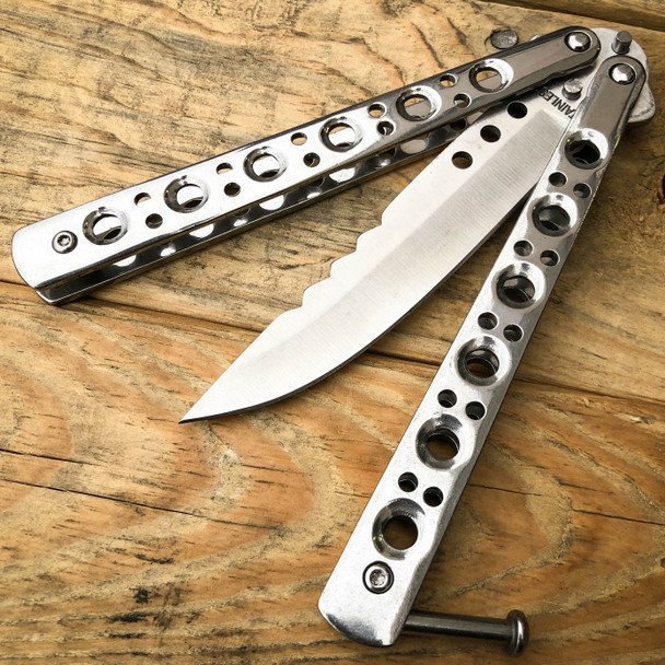 Dieses Balisong ist scharf und hat jede Menge Charakter. Die 9 Zoll lange Klinge aus rostfreiem Stahl ist perfekt für den täglichen Gebrauch. Der Riegel verriegelt die Griffe sowohl im offenen als auch im geschlossenen Zustand, um ein versehentliches Öffnen oder Schließen zu verhindern. Leicht und witzig für Tricks und Flips.